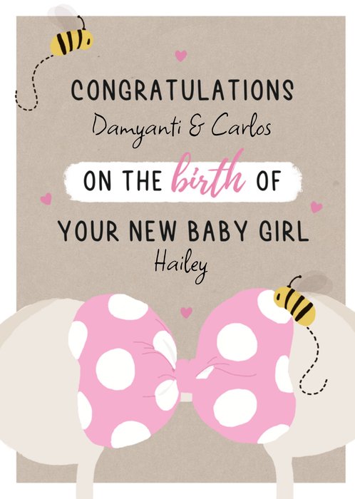 Front of card: Featuring an illustration of a Minnie Mouse head band. Text reads: "Congratulations Damyanti & Carlos on the birth of your new baby girl Hailey". 'Damyanti & Carlos' and 'Hailey' can be personalised!