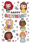 Featuring a white background with many cute and colourful Disney princess characters. The card also has musical notes, hearts, stars, and diamonds to make it more festive and fun. The main text is written in big and bold letters in the centre of the image.