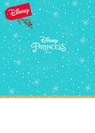 Features Disney Princesses Tiana, Belle, Jasmine, Mulan and Rapunzel holding presents, surrounded by snowflakes against a purple background. There are two photo uploads at the top of the card.
