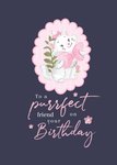 The greeting card features a cute illustration of a white kitten with a large pink bow, framed in a scalloped pink border against a dark purple background. The text reads, “To a purrfect friend on your Birthday” in elegant script and serif fonts, with small flower accents scattered around, creating a charming and friendly design.