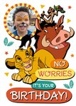 A joyful greeting card with Simba, Pumbaa, and Timon from Disney's The Lion King, featuring a circular photo area at the top left and colourful birthday text on a bright white background.
