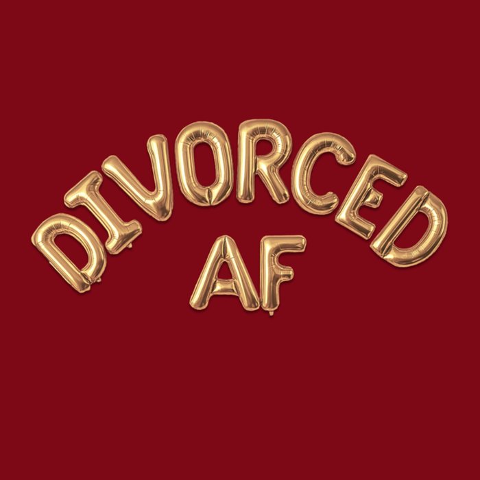 Featuring gold foil-style balloon letters spelling out “Divorced AF” arranged in an arc on a deep red background.
