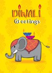 Featuring an illustration of an elephant with Diya candles on a yellow pattern background.