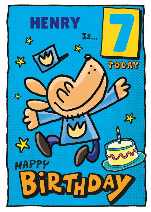 Featuring Dogman jumping in the air, with a large number in a panel at the top right, scattered yellow stars and a birthday cake with one candle at the bottom, on a bright blue background.