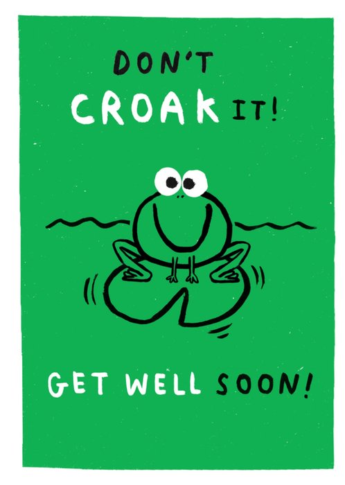 Featuring a smiling cartoon frog sitting on a lily pad with ripples of water around it, on a green background with a white edge.