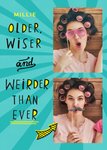 Front of card: 2 photo upload areas on the right side of card with funny birthday message to the left in funky black and yellow text with editable name. There’s a black and yellow arrow at the bottom pointing to a photo upload area all on a blue tonal patterned background.br>Text reads: "Millie Older, wiser and weirder than ever"< br>With customisable name