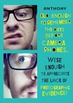 Front of card: 2 photo upload areas on the left side of card with funny birthday message to the right in funky black and yellow text with editable name, all on a blue tonal patterned background. Text reads: "Anthony Old enough to remember the days before camera phones… wise enough to appreciate the lack of photographic evidence!"< br>With customisable name