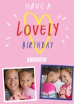 Front of card: 2 photo upload squares in the bottom third of the card. Above is a hand drawn yellow heart with white flash marks sitting behind the large birthday message in red and blue hand written text and editable name in white on a pink background. Text reads: "Have a lovely birthday Brooklyn" With customisable name.