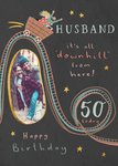 "Husband it's all 'downhill' from here!", "50 today Happy Birthday".
