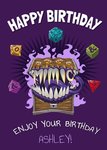 Front of card: Dungeons And Dragons Birthday Card Illustration of a mimic chest. Text reads: "Happy birthday enjoy your birthday Ashley!". 'Ashley!' can be personalised!