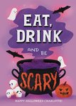 This Halloween-themed card features bold text that reads “Eat, Drink And Be Scary” above a bubbling black cauldron, set against a purple background with playful illustrations of bats, ghosts, skulls, and a carved pumpkin, giving a spooky yet fun atmosphere.
