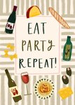 A fun and stylish illustrated card featuring a food and drink theme with pasta, wine, cheese, and bread. The central text is in a playful handwritten font. Perfect for food lovers.