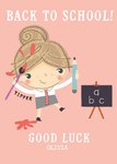 Front of card: Cute illustration of a schoolgirl and a chalkboard with white text above and below on a peach coloured background with editable name. Text reads:"Back to school! Good luck Olivia" With customisable name.