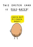 Front of card: Featuring a funny illustration of an egg character showing its crack. Text reads: "This easter car is eggs-rated! Check out my crack, Dave!". 'Dave!' can be personalised!