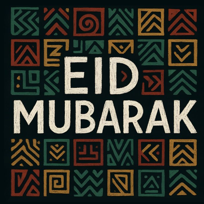 A modern design featuring bold hand-drawn Eid Mubarak lettering framed by a colourful geometric tile pattern on a black background.