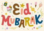 A colourful, modern design featuring hand-drawn Eid Mubarak lettering surrounded by sweets, stars, confetti and gift icons on a cream background.