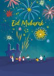 Front of card: A vibrant, hand-painted design featuring a night sky with colourful fireworks above a mosque silhouette and a group of people celebrating on a teal blue background.