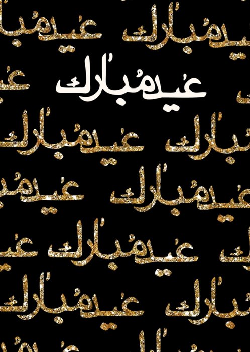 A bold design featuring a repeating gold glitter Arabic Eid greeting with a larger central message in white on a black background.