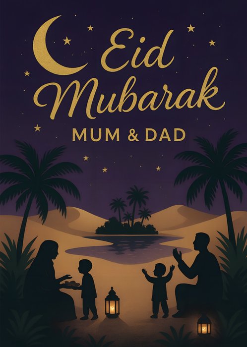 A warm, illustrative design featuring gold script text, a crescent moon and stars above an illustrated desert scene with silhouettes of palm trees, lanterns and a family on a dark purple background.