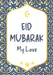 Front of card: A vibrant design featuring a gold crescent moon and star above hand lettered text inside a gold trimmed arch frame with a geometric tile pattern border.