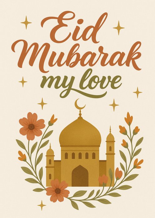 Eid Mubarak My Love Illustrated Mosque And Flowers Card