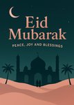 A modern, illustrative design featuring a large Eid Mubarak message above a silhouette mosque, crescent moon, stars, palm trees, sand dunes and a walking couple on a dark teal background.