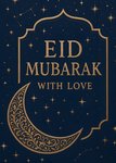A modern design featuring gold typography inside an ornate arch frame with a patterned crescent moon and scattered stars on a navy blue background