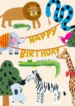 A playful Eleanor Bowmer birthday card featuring a colourful collection of illustrated jungle animals, including a lion, snake, giraffe, zebra, and elephant, gathered around a “Happy Birthday” banner.