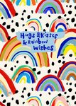 Front of card: This ‘Eleanor Bowmer’ greeting card design features multiple illustrations of brightly coloured rainbows surrounded by black, painted dots. There is blue text in the centre of the card.