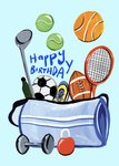 This Eleanor Bowmer greeting card features a vibrant illustration of a sports bag overflowing with various sports equipment, symbolising a celebration of sports enthusiasm perfect for a birthday, with a prominent “Happy Birthday” message adorned above.