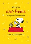 Front of card: Featuring an illustration of Snoopy and Woodstock toasting with mugs while sitting on a red doghouse. Surrounded by little stars and swirls and black & red foil typography, all on a bright yellow background. Text reads: "May your new home bring endless smiles and happiness!"