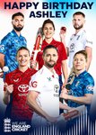 This greeting card features a mixed group of England men’s and women’s cricket players wearing red, blue, and white England cricket shirts, holding bats and balls, with the England Cricket logo on a gradient background.
