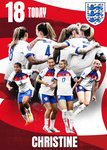 A bold and action-packed greeting card celebrating a milestone birthday with energetic images of the England Lionesses football team, featuring a large photo collage and a vivid red and white background.