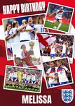 A lively and uplifting greeting card bursting with England Lionesses moments, from goal celebrations to trophy lifts, arranged collage-style over a vibrant red and white background, with a bold birthday greeting at the top.