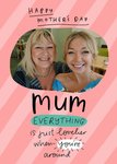 Front of card: Featuring handwritten typography with a circular photo frame on a striped pink background. Text reads: "Happy Mother's Day mum everything is just lovelier when you're around".