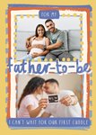 A warm and heartfelt card featuring two photo frames surrounded by playful, colourful borders and handwritten-style text, the card expresses excitement and love for a soon-to-be father.