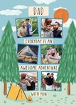 Front of card: Father's Day Photo Upload Card Outdoors themed illustration with six photo frames. Text reads: "Dad everyday is an awesome adventure with you".