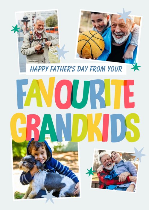 Front of card: Father's Day Photo Upload Card Collage of photo frames with colourful typography. Text reads: "Happy Father's Day from your favourite grandkids!".
