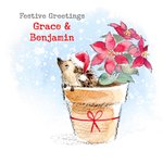 Front of card: Featuring a festive illustration hedgehog wearing a Santa hat snugly nestled inside a flower pot. Text reads: "Festive greetings Grace & Benjamin". All text can be personalised!