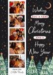 A warm and embracing Christmas card featuring a hand-drawn Christmas winter scene illustration including chalk Christmas trees with stars on top of each, there is snowfall, stars and a crescent moon in the background. There are 5 photo upload areas within a photo strip.