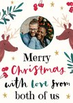 Front of card: A warm-hearted and festive Christmas card featuring hand-painted style reindeer with holly and berries. There is one photo upload area in the centre. The text is in a hand-written calligraphic style.