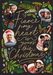 Featuring illustrated Christmas themed items such as sprigs of holly, red berries, presents and foliage. Amongst the illustrations are five photo upload frames. In the centre of the card is gold handwritten style text.