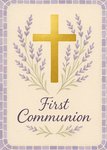 Illustration of a gold cross surrounded by purple and green foliage, with a script message in purple below. The design has a purple tiled edge and a warm cream background.