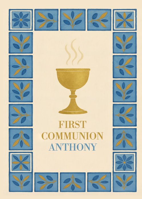 Illustration of a gold chalice with a traditional message below and space for an editable name. The design has a frame of blue patterned tiles and a warm cream background.