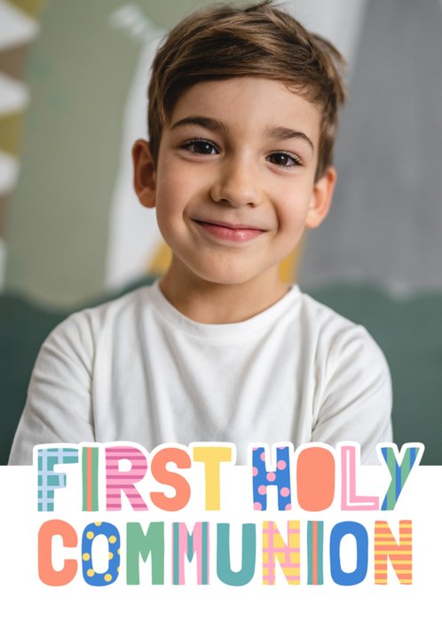 Featuring colourful, patterned text on a white frame below a large single photo upload.
