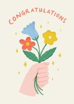 Featuring an illustration of a hand holding a blue, orange and yellow flower with text above in the arch shape.