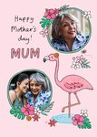 Front of card: Illustration of a flamingo surrounded by two photo uploads and tropical flowers, on a pink background. Text reads: "Happy Mother's Day! Mum."