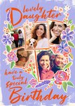 Featuring a collage of 5 photo uploads with an orange frame, surrounded by illustrated flowers and dark orange text, on a lilac paint effect background.
