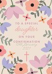 Front of card: Beige background, featuring floral design around the edges of the card. Personalised text in the center of the card, text shows the date of the event. Has a bare cross at the bottom of the design.