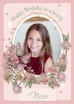 Front of card: Flower Fairies Lovely Niece Photo Upload Birthday Card Traditional style, fairy and flowers. Pink theme with 1 photo upload. Text reads: "Happy Birthday To A Lovely Neice". Personalised name